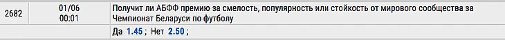 Получит ли АБФФ премию за смелость, популярность или стойкость от мирового сообщества за Чемпионат Беларуси по футболу - нет за 2.50