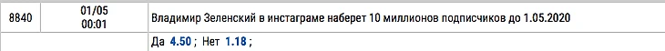 Ну и напоследок про президента Украины. Сейчас у него 9.4 млн. подписчиков в инстаграм, Parimatch предлагает линию на 10 млн. до 1 мая. Коэффициент небольшой, но вероятность захода 99%. Так как в течении трех недель ему надо выбивать по 200 000 подписчиков, за прошлую неделю прироста не набралось и на 100 000. Не понимаю откуда взялись такие красивые цифры. Да и повода для всплеска новых подписок нет. Дела в экономике на фоне пандемии и карантина не айс, перспективы выхода из карантина туманные, методы борьбы с проблемой – странные. В общем тут и 9 500 000 может не набраться.