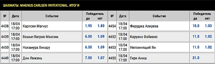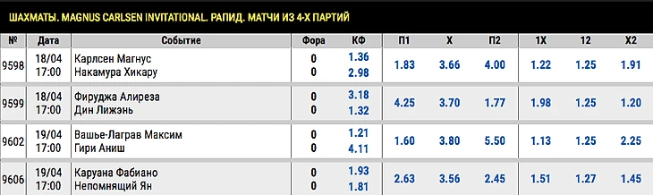 Турнир только начинается, возможности и тонус шахматистов выясним по ходу. Пока я бы отметил, что можно заиграть горячего Фируджу c форой (0) за 3.18. Во-первых, он только на прошлой неделе выиграл турнир в рапиде, где переиграл самого Карлсона. Во вторых, он хорош в этой дисциплине и был вторым на чемпионате мира по быстрым шахматам в 2019 и шестым в 2018-м. А Дин находился в плохой форме в марте на турнире претендентов в Екатеринбурге. Китаец тоже может блеснуть в рапиде, в прошлом году он затащил небольшой, но престижный турнирчик в Лондоне, где и Карлсен выступал. Но Фируджа куда горячей сейчас и должен идти по равной, а не явным андердогом. Валуй тут наблюдается.