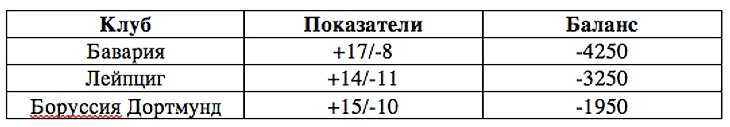 В Бундеслиге у фаворитов все сложно. Вот так выглядят показатели тройки лидеров и одновременно признанных фаворитов. Расчет относительно ставок на их чистую победу в каждом матче.