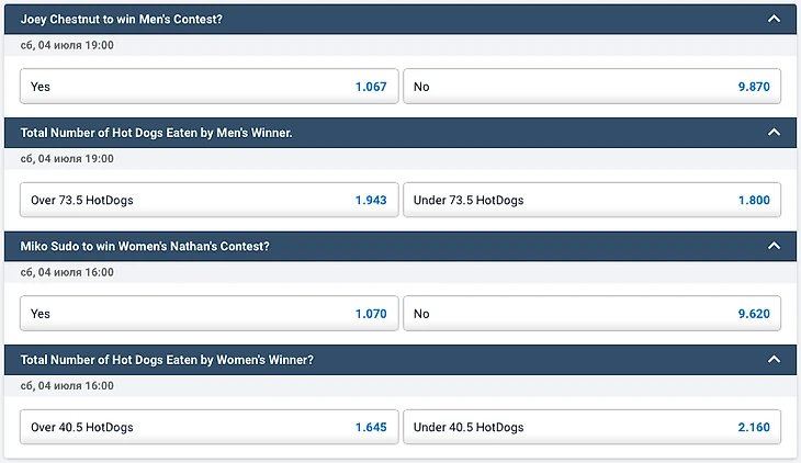 В 2018-м он установил мировой рекорд, съев 74 хот-дога за 10 минут. В прошлом году — только 71. В 2017 за 10 минут съел 72 хот-дога, а годом ранее влупил 70 булочек с сосиской. В голове не укладывается как так можно и что у него с желудком, но то такое, главное, что вам нужно знать, что фаворит он по праву. В этом году Джои тоже безусловный фаворит, вопрос не в его победе, а в количестве съеденных булочек с сосиской. Сейчас на него принимают тотал 73.5 Pinnacle и Betcity,только у Пинки коэффициент почти в два раза больше: 1.819 против 1.57. Линия 1х построена вокруг тотала 71.5 хот-дога, предложение может быть интересно тем, кто хочет сыграть на больше. Но я предлагаю сыграть низ.
