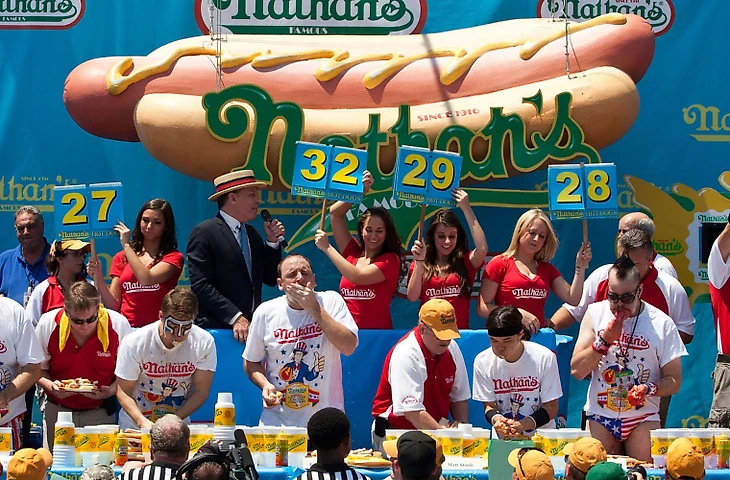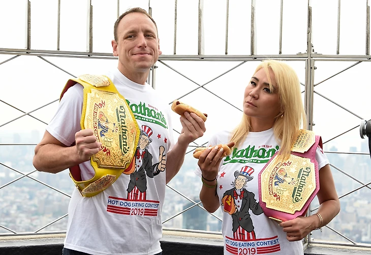 Немного экзотики в ленту. Америка сильна традициями. Одной из таких традиций стал конкурс поедание хот-догов на скорость на день Независимости, который в США сегодня. Проходит это мероприятие уже не один десяток лет и даже есть свои признанные фавориты. У мужчин это многократный победить - Наталь Честнат, а у женщин Мики Судо. В этот раз они тоже главные претенденты на победу.