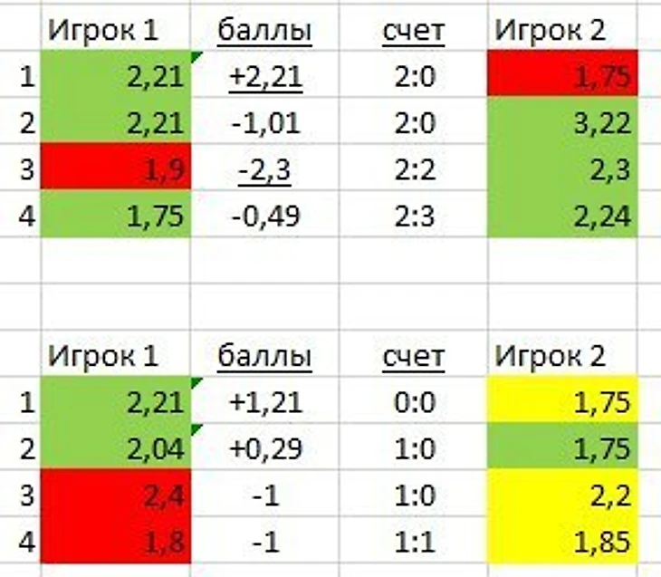 Если у игрока был возврат (желтый цвет), то против ставки соперника он оценивается как 1 балл. Т. е. если у соперника незаход – это +1 балл, например, пример 2, 3-я и 4-я пара ставок. Таким образом, два возврата против двух незаходов соперника дают гол (2 в сумме > 1,5). Если у соперника ставка зашла, то из зашедшего кэфа отнимается 1 балл: 2,21-1=1,21 в первой паре второго примера.