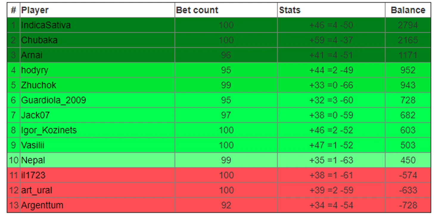 В пятницу завершается 12ый Betting King, Короля мы определили уже, им стал небезызвестный IndicaSativa, причем он не просто одел корону, а поставил рекорд по балансу турниров Betting King и не просто поставил рекорд а разнес всех рекордсменов в пух и прах заработав аж 2794 единицы, что эквивалентно ~28% ROI, это на дистанции в сто ставок. Предыдущий рекорд был 2247 и к слову разница между этими двумя рекордами очень долга была рекордом беттинг кинга.