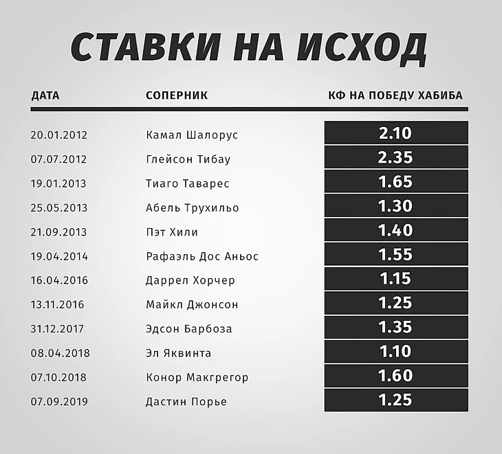 Как бы там ни было, но ставки на победу Хабиба себя оправдывали всегда благодаря 100-процентной проходимости. Прирост капитала при регулярных ставках на него, с учетом последней победы над Гэтжи, составил бы больше 60%, а если все ставки на него оформить горизонтальным экспрессом (весь выигрыш ставится на новый бой), то можно было бы увеличить сумму первоначальной ставки в 100 раз.