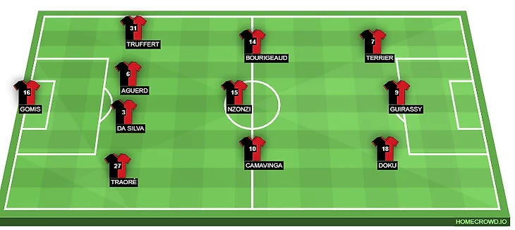 Стефан по какой то причине использует Гирасси в атаке, хотя этот африканец никогда не был забивным игроком, его лучший результат 9 мячей в 23 матчах за Амьен в прошлом сезоне. Не понимаю зачем было делать на него ставку, в этом сезоне у него 3 мяча в 10 играх, безголевая составляет 6 матчей. А вот кто будет играть на флангах атаки, фиг поймешь. Скорее всего это Доку и Террьер, в полузащите я тоже делаю ставку на трио защищающихся полузащитников Нзонзи, Камавинга и Бурежо.