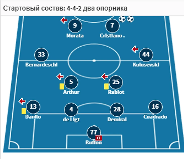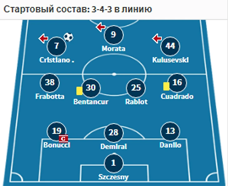 Я считаю что Юве сыграет по той же схеме что и в прошлый раз, но во время игры она переходит в такую.В атаке кроме Криштиану и Мораты должен будет сыграть Бернардески, на флангах полузащиты Куардадо и Кулусевски, Рабьо и Артур в центре, в защите де Лигт, Алекс Сандро и Данило.