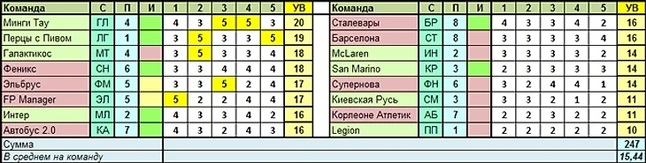 Лучший игрок тура по сумме УВ: Oleg23k (Галактикос), Def_Joint199, Sokrat_57 (оба – Минги Тау), butra butra, Минай1990 (оба – Перцы с Пивом), Alexander Sessa (FP Manager), Артём Клементьев (Эльбрус) – 5 вариантов