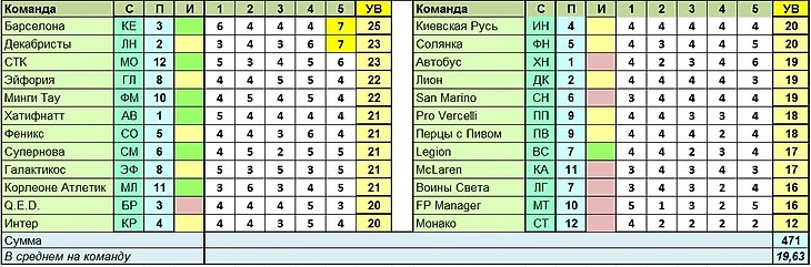 Лучшая команда тура по сумме УВ в целом: Барселона –25 вариантов