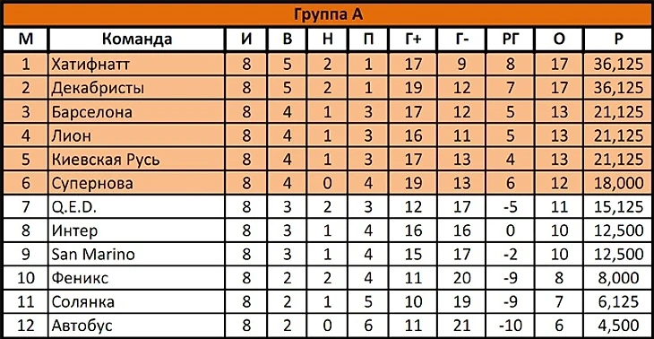 В группе A вновь двоевластие: Декабристы потеряли очки, чем воспользовался Хатифнатт. В группе B Минги Тау в очной встрече переиграл конкурента и немного оторвался от преследователей.