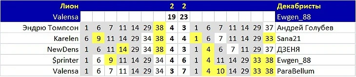 Декабристы победили бы, если бы Valensa с 3 УВ оказалась на первой, второй или третьей линии, остальные раскладки не имеют значения. То есть это 2 шанса из 5 для Лиона -Valensa на 4 или 5 линии. Один из этих благоприятных вариантов и случился.