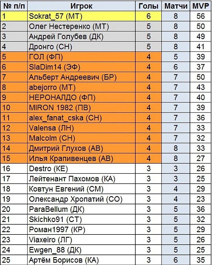 А гонку бомбардиров возглавил Sokrat_57 (Минги Тау) – 6 голов.