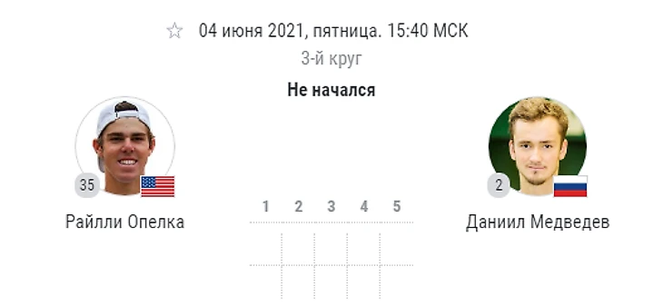 Грунт для Медведева неудобное покрытие, поэтому поединок должен затянуться. За счет подачи американец может доставить проблемы, у него 10 эйсов в первом круге и 18 во втором. Даниил часто отдает свою подачу, поэтому 3-0 по сетам ожидать не стоит. Корты достаточно быстрые, поэтому не исключаю нескольких тай-брейков. На исход ставить не рискну, учитывая нелюбовь Медведева к грунту Опелка может побороться за победу.