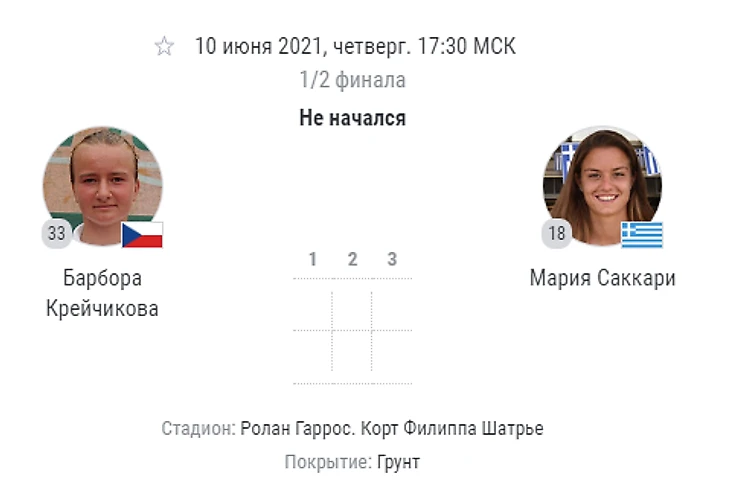 Обе теннисистка дебютируют на такой высокой стадии шлемов, фаворитом считается Саккари, но чешка в этом сезоне на грунте играет хорошо. Мария Саккари преподнесла главную сенсацию турнира обыграв прошлогоднюю финалистку Игу Швентек в двух сетах. Барбора Крейчикова сломила сопротивление американки Гауф. Если не вмешаются нервы, то матч должен получиться достаточно близким, теннисистки примерно одного уровня и разгромного счета быть не должно. Чешка в хорошей форме, поэтому можно попытаться взять ее победу с плюсовой форой.