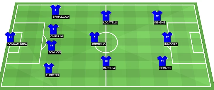 От подопечных Роберто Манчини я жду такой состав, ничего нового здесь не будет, привычные 4-3-3, где крайние защитники постоянно подключаются к атаке, так как двойка ЦЗ читается без лишних слов, то на флангах Спинаццола и Флоренци, в центре пока под вопросом Верратти у которого проблемы с коленом и он еще не готов играть, но возможно появится. Его место займет Локателли из Сассуосо. В атаке тоже все читаемо, Иммобиле на острие, ложная "десятка" Инсинье и справа Берарди. Возможно вместо последнего выйдет Кьеза, пока этого знать не можем.