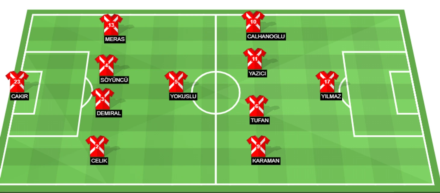 Никто не сомневается что Турция сыграет в одного нападающего, по схеме 4-5-1, которая подразумевает наличие в центре поля опорника Йокушлу и помощника для него в лице Туфана, по флангам игрок Милана Чалхоноглу, справа Караман, в центре Язычи.