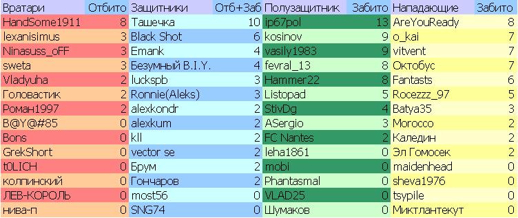 Для линии атаки (как для полузащитников, так и для нападающих) сегодня также двойные данные: забитые мячи + в скобках указано количество упущенных очков (отбитые соперником голы). Кажется, тут есть явный лидер :) Отмечу, как хорошо накрыли leha1861 девочки из Семечек.