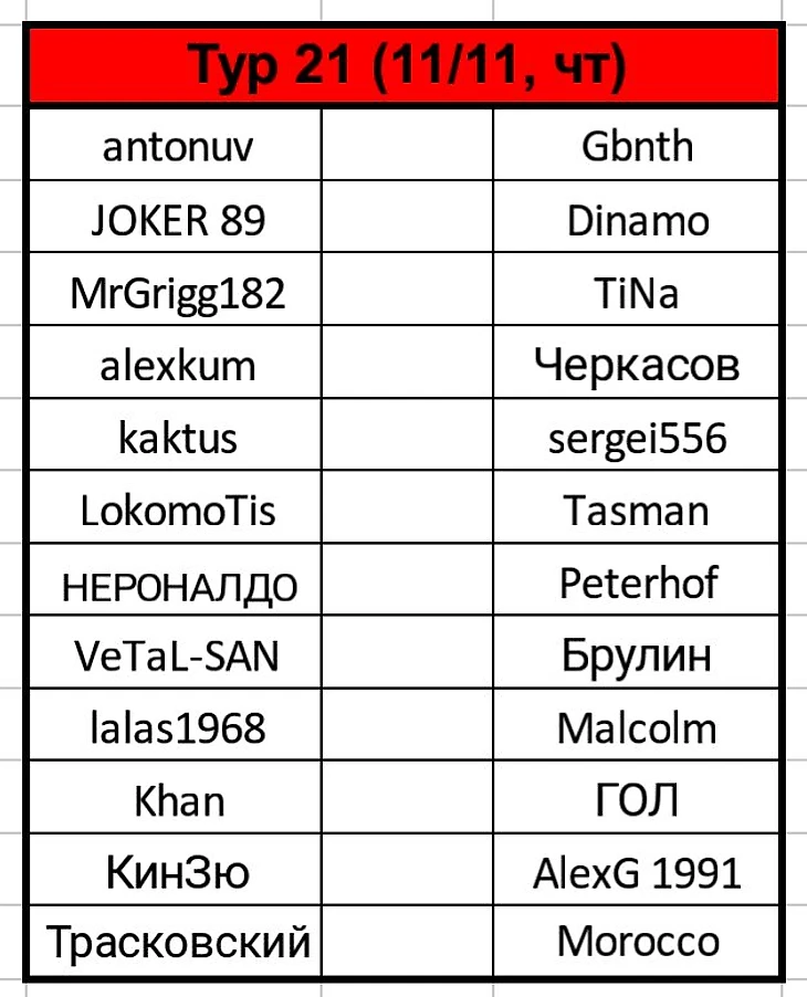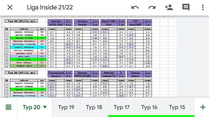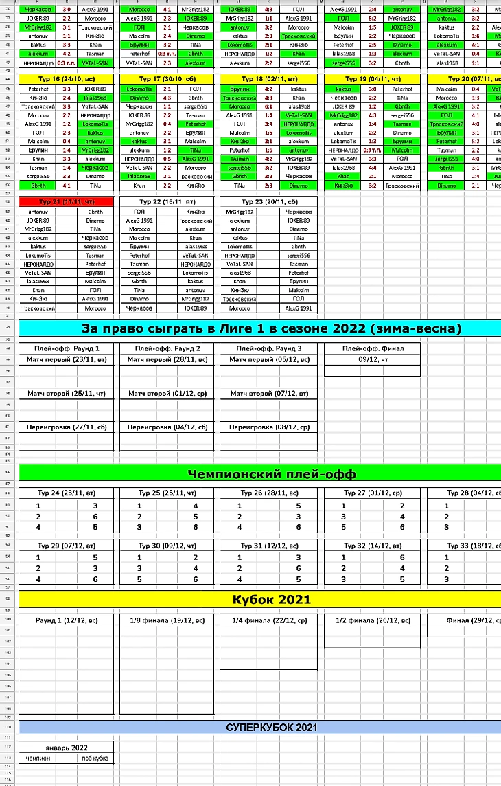 В августе 2021 стартовал чемпионат на основе всех топовых чемпионатов и матчей в мире футбола. С августа по декабрь было или будет суммарно проведено 33-36 игровых дня (=туров) в чемпионате и еще 5 в кубке Лиги. Еженедельно проводится по 1-3 тура. Все прогнозы участники оставляют в личном гугл-файле.