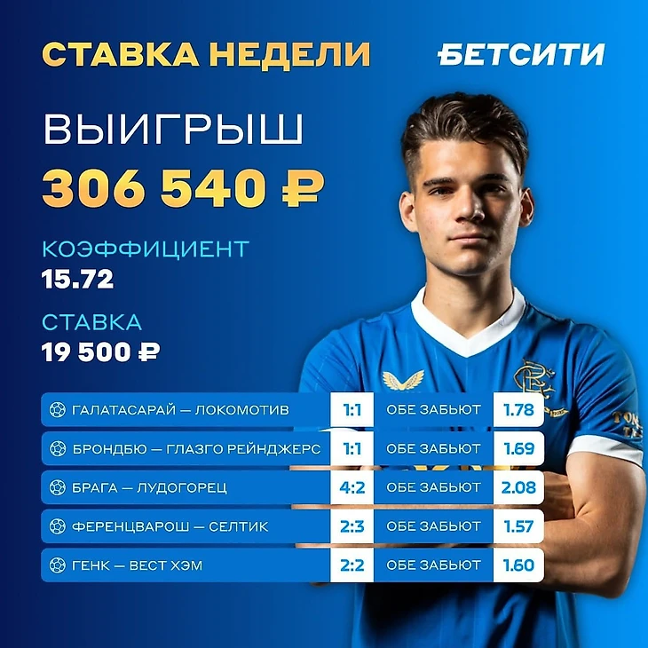 В прошлый четверг он собрал экспресс из пяти событий 4-го тура группового этапа Лиги Европы. В каждом матче наш герой выбрал ставку «обе забьют». Общий коэффициент получился 15.72, а сумма ставки — 19 500 рублей.