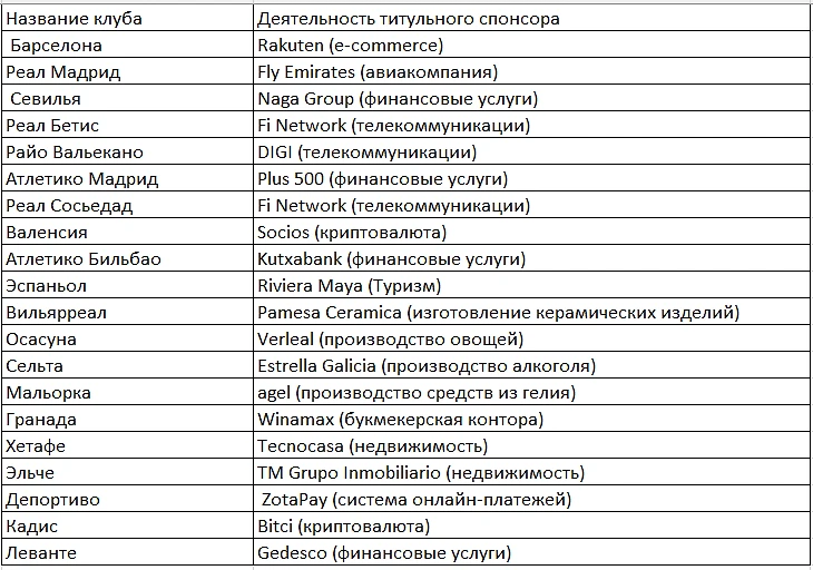 Испанский чемпионат имеют следующую концепцию клубов и их титульных спонсоров: