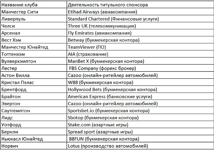 Всего три команды имеют спонсоров в сфере беттинга, что не является достаточно большим показателем. Клубы заточены под сотрудничество с организациями, которые занимаются удовлетворением наиболее важных вопросов человечества.