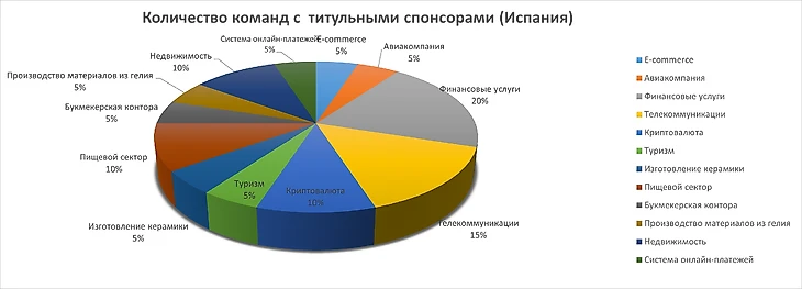 Как видно на диаграмме, всего одна команда выбрала в качестве титульного спонсора букмекерскую компанию. Это связано с правилами, которая ввела Федерация испанского футбола. По новым регламентам, клуб не может иметь в качестве спонсора компанию, которая занимается беттингом или онлайн-казино.