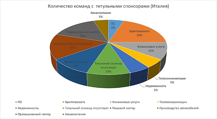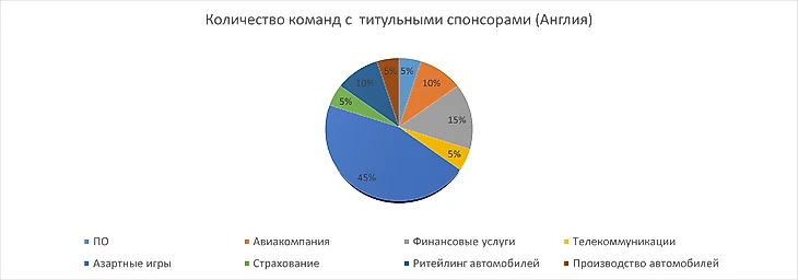 Как видно из диаграммы, у 45% команд титульные спонсоры работают в сфере азартных игр, в том числе и ставок. Подобное можно объяснить только тем, что Англия-это родина футбола. Здесь люди сходят с ума от этого вида спорта, они не просто его смотрят, но и пытаются предугадать исходы конкретного матча. В Англии представлено огромное количество различных букмекерских контор, где фанаты футбола оставляют свои деньги на подобное развлечение. Это формирует особый мир для жителей Англии.