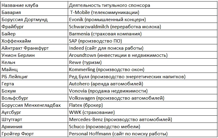 Чемпионат Германии также полностью очищен. Спонсоры участников Бундеслиги действуют в тех сферах, которые наиболее актуальны для современного человека: