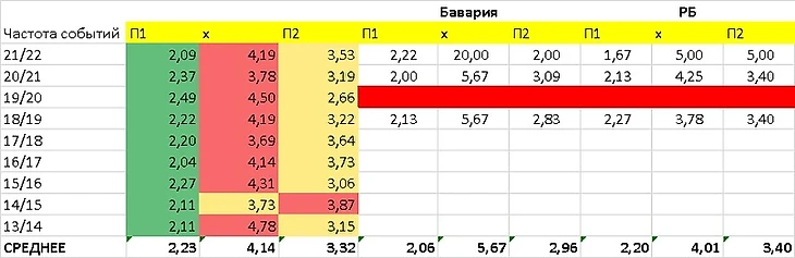 И как видим, самое наименьшее отклонение от среднего после 21 тура будет при исходе Х в матче Бавария — РБ.