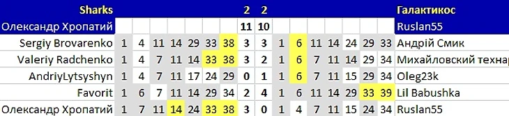 5. Олександр Хропатий (1-7-11-14-24-33-38/4-29/39) - Ruslan55 (1-4-7-11-15-24-34/6-14/29) 3:0 (3) 0:1 1:0