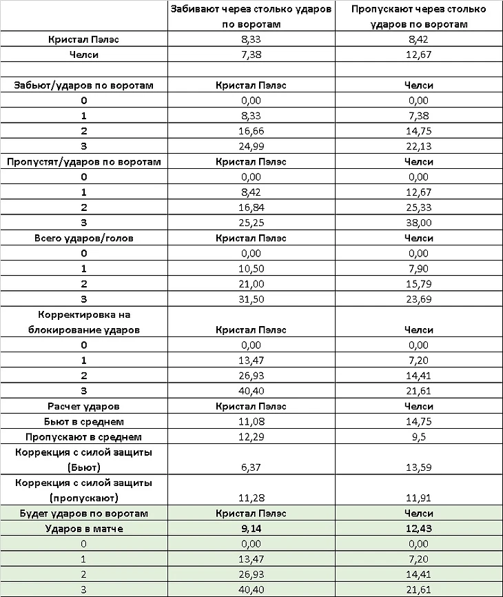 Видно, что для 1 гола в матче против Кристала, Челси понадобится 7,2 удара по воротам. А команда по прогнозу ударит 12,43. Т.е. команда на 1 гол наиграет.