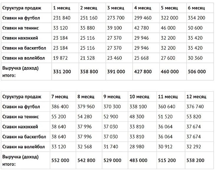 В рассматриваемой букмекерской конторе ставки будут приниматься на следующие виды спорта: футбол, теннис, хоккей, баскетбол, волейбол. Усредненный план продаж для города-миллионника составлен на основе среднестатистических данных по букмекерским конторам такого же формата за 2017 год с поправкой на инфляцию. В зависимости от сезона, проведения наиболее значимых игр уровень продаж может меняться. Средняя ставка по рынку составляет 500-1000 руб. В день в букмекерской конторе делают ставки в среднем 20-30 человек. В 95% случаев букмекерская контора остается в выигрыше. Как пишет rbc.ru, планируется значительный рост в данной нише (в 3 раза). Таким образом, при успешном входе на рынок проект обладает потенциалом для увеличения средней выручки.