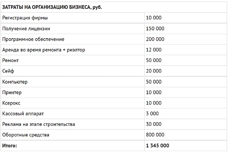 Инвестиционные затраты на открытие данного бизнеса составляют 1 345 000 руб.