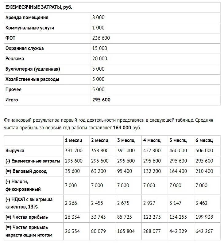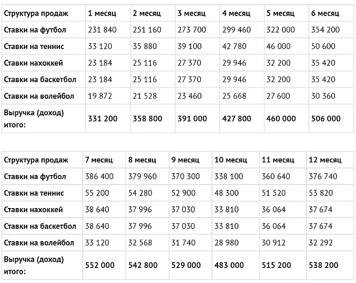 В рассматриваемой букмекерской конторе ставки будут приниматься на следующие виды спорта: футбол, теннис, хоккей, баскетбол, волейбол. Усредненный план продаж для города-миллионника составлен на основе среднестатистических данных по букмекерским конторам такого же формата за 2017 год с поправкой на инфляцию. В зависимости от сезона, проведения наиболее значимых игр уровень продаж может меняться. Средняя ставка по рынку составляет 500-1000 руб. В день в букмекерской конторе делают ставки в среднем 20-30 человек. В 95% случаев букмекерская контора остается в выигрыше. Как пишет rbc.ru, планируется значительный рост в данной нише (в 3 раза). Таким образом, при успешном входе на рынок проект обладает потенциалом для увеличения средней выручки.