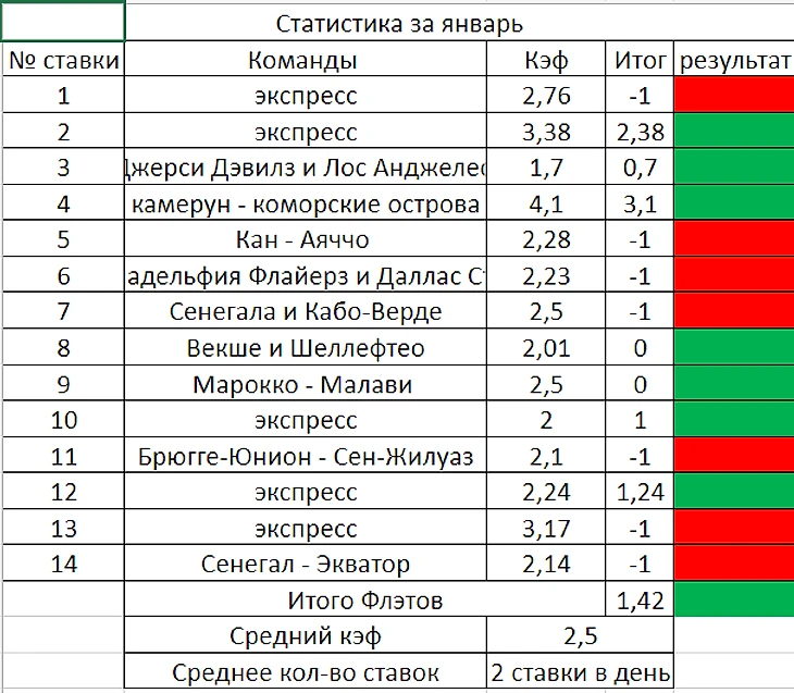 Добрый вечер, дорогие подписчики! Пора подвести итоги наших прогнозов за январь и в связи с этим мы подготовили для вас полную статистику наших прогнозов за январь Напоминаем, что мы не удаляем наши прогнозы и ведем абсолютно честную и прозрачную статистику, как вы можете сами заметить.  Просим вас рассмотреть нашу полную статистику во вложении и самим убедиться, что каждый месяц мы делаем плюс