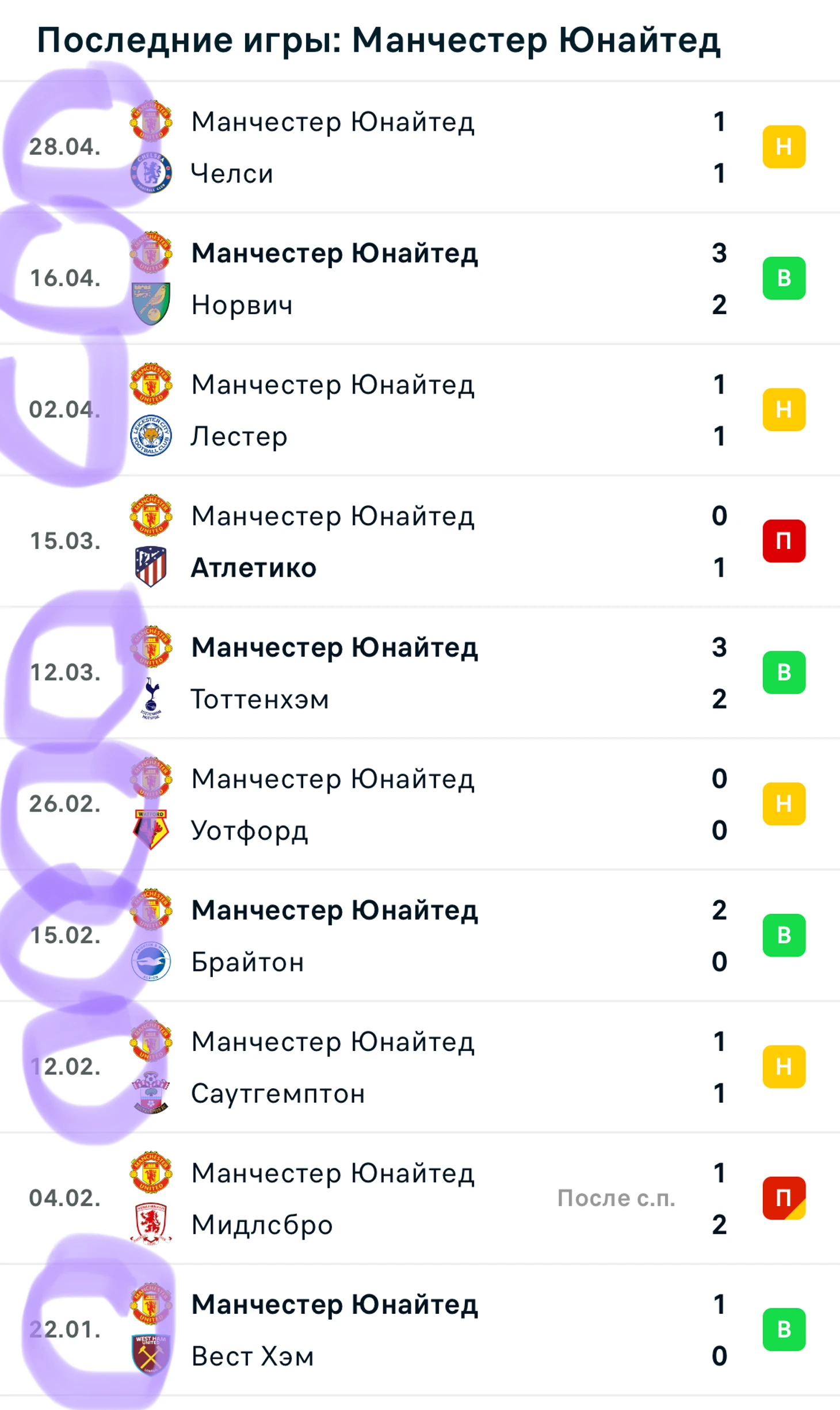 Кружком выделил матчи в АПЛ! Ничего не надо напрягает? Серия у МЮ по чередованию исходов - победа/х/победа/х. Серия уже из 8 матчей!