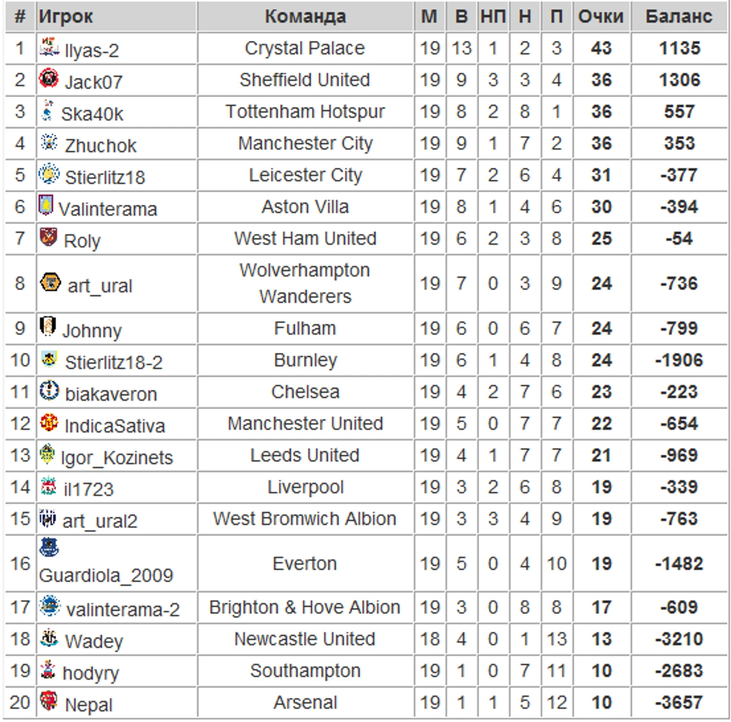 Я тут уже 14ый турнир по ставкам на АПЛ провожу, чтобы заполнить полную таблицу нужно еще 8 игроков ставочников любителей английской лиги.