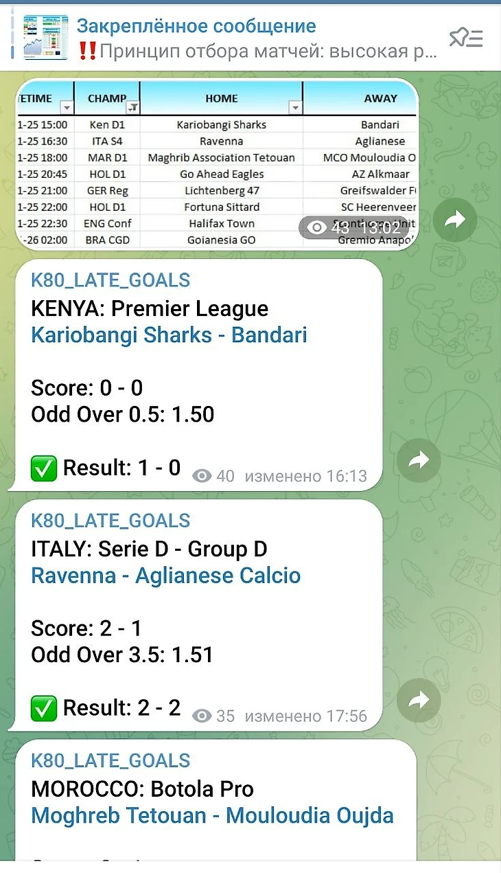 Еще одна часто используемая связка, из общего отбора и бота на поздние голы. Когда вы видите что во 2 тайме не было голов, в предыдущих матчах, а сейчас идет матч, на который еще и сигнал пришел от бота, надо брать !