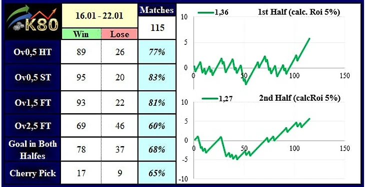 Голы в 1 тайме забили в 77% отобранных матчей. Наименее удачным днем оказался день 19 января с 67%. Зато матчи воскресения, 22 января принесли Отличный доход, 91% (29 из 32) !