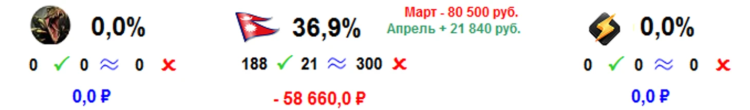 Блин, ну и холодно у вас в Москве)))).Ну, что закончили мы очередной месяц. Вроде не проиграли ничего. Посчитаемся завтра. Ну вы поняли,что нумерация теперь сквозная, а не ,как обычно каждый месяц всё сначала. Соответственно и сумма в шапке - общий выигрыш/проигрыш (за март-апрель).