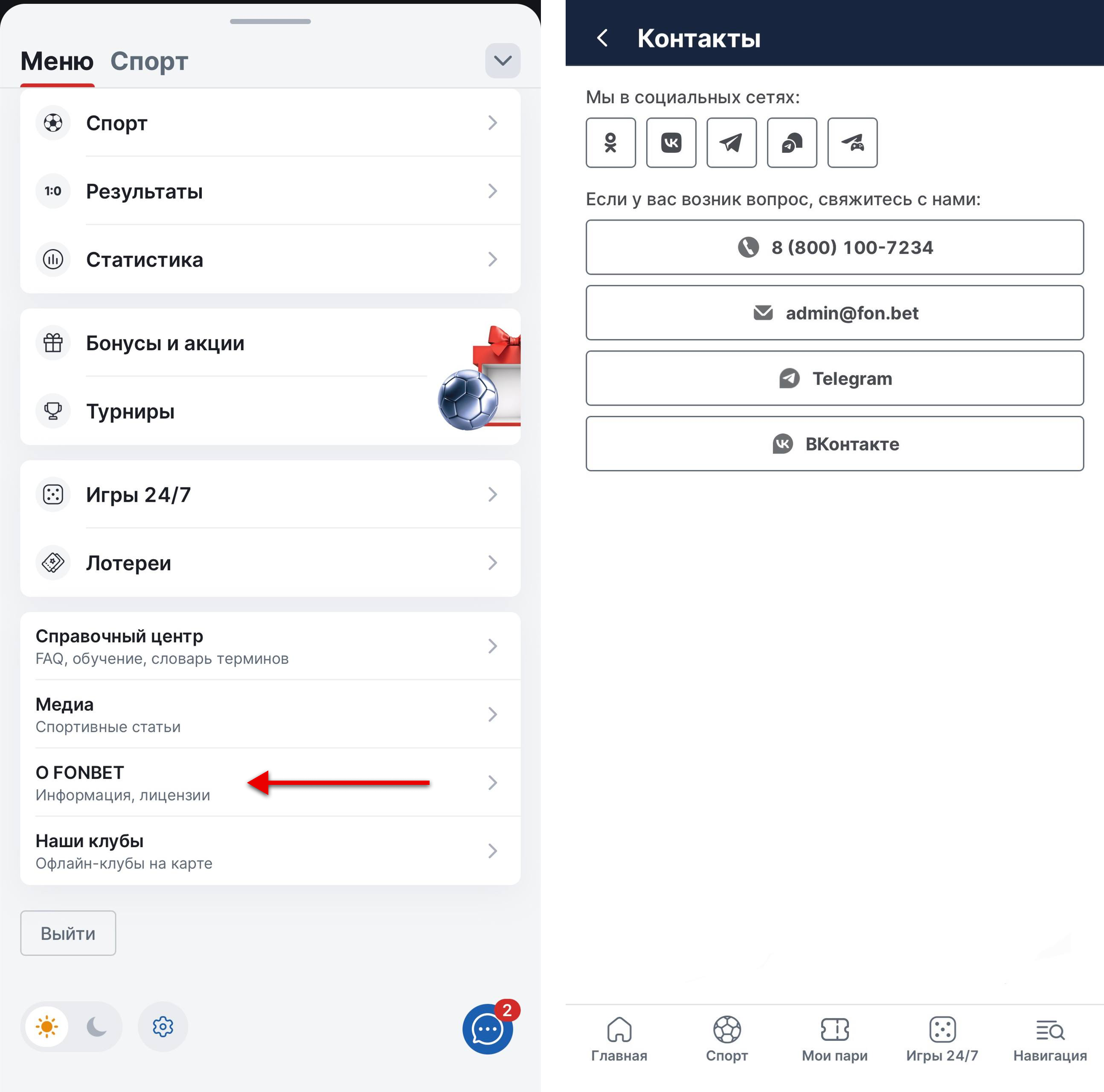 В приложении букмекерской конторы все способы связи со службой поддержки представлены в «Контактном центре». Он находится в меню.