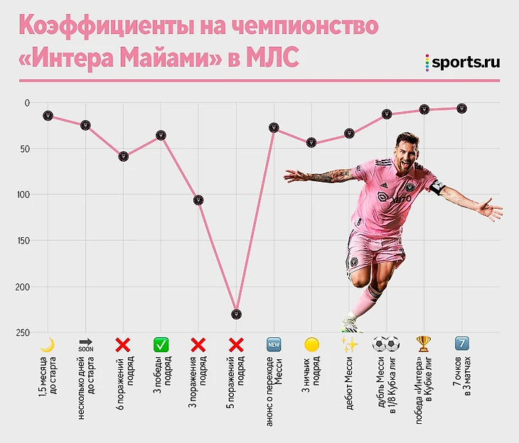 Дебют Лео в июле подкорректировал и эти значения. «Интер» выиграл с Месси Кубок лиг – коэффициент стал меньше десятки. Еще больше его снизил старт аргентинца в МЛС – «Интер» в трех матчах с ним набрал семь очков из девяти возможных. Так коэффициент и пришел к значению 6.50.