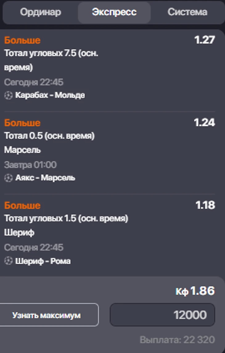 События экспресса по порядку: угл. 9-1, Марсель забил в 1-м тайме, угл. 4-2. Прогноз верный.