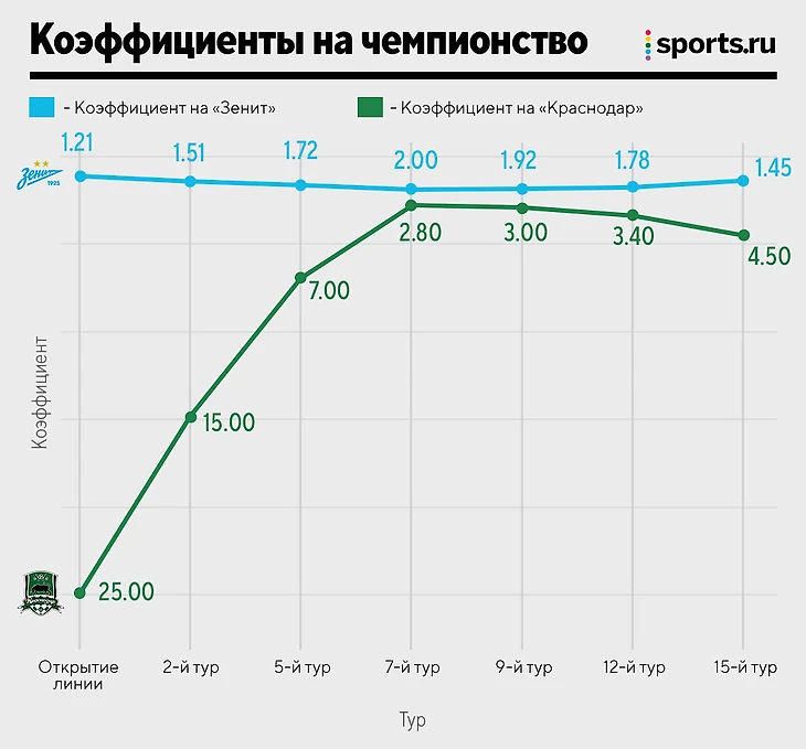● Сколько бы мы не говорили про невероятный «Краснодар» в этом сезоне, но «Зенит» все равно ни разу не удалось обогнать по коэффициентам на чемпионство. Ближе всего линии приблизились в районе седьмого тура, когда на «Зенит» давали 2.00, а на «Краснодар» – 2.80.