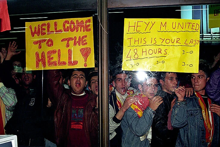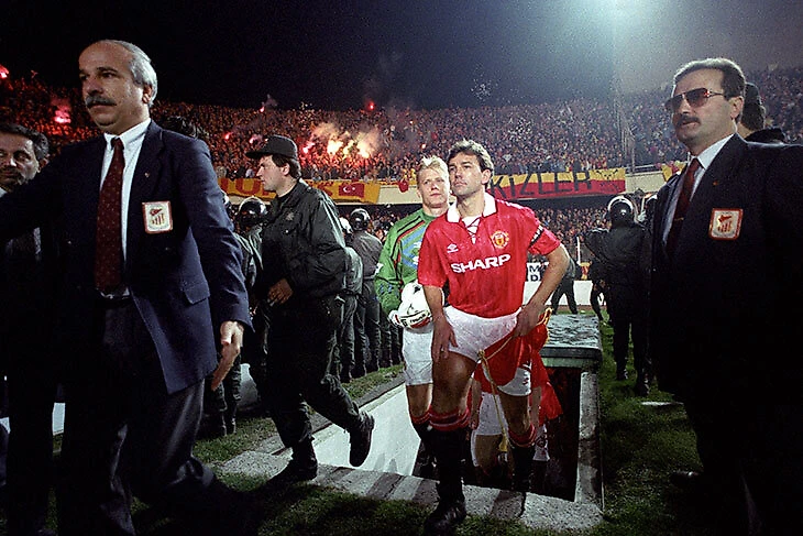 Уже в Манчестере было неспокойно – во время игры Петер Шмейхель вытолкал с поля курдских демонстрантов с флагами, за что наслушался оскорблений с трибун. А в Стамбуле «МЮ» встречали в атмосфере тотальной враждебности, которую пообещал сопернику немецкий главный тренер «Галатасарая» Райнер Хольманн. Было много фанатов «Галатасарая» с баннерами «Добро пожаловать в ад» и выкриками «это ваши последние 48 часов». Защитнику Полу Паркеру один из них заявил прямо: «Ты умрешь».