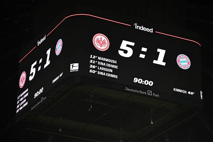Изначально «Бавария» считалась явным фаворитом матча во Франкфурте – 1.40 на прямую победу. Но к 36-й минуте горела уже 0:3, и гол Йозуа Киммиха перед перерывом все равно не скрыл проблемы чемпиона. А к 60-й минуте «Айнтрахт» забил пять. Так и завершилось – 5:1.