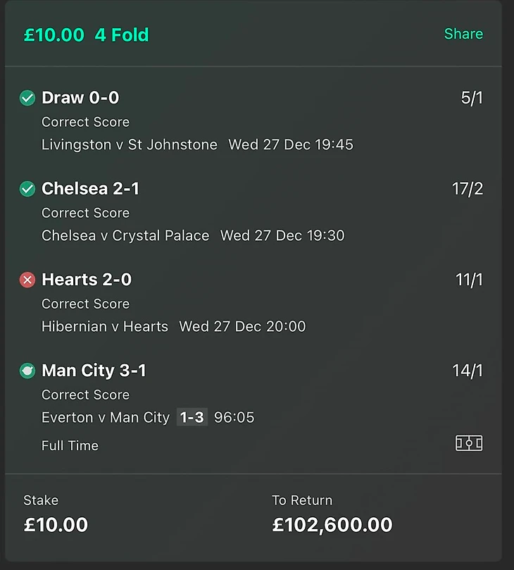 Футбольный фанат из Великобритании был в шаге от того, чтобы разбогатеть на 100 тысяч фунтов. Мужчина по имени Эндрю сделал ставку в одной из букмекерских контор, попытавшись предсказать точные счета четырех матчей чемпионатов Англии и Шотландии.