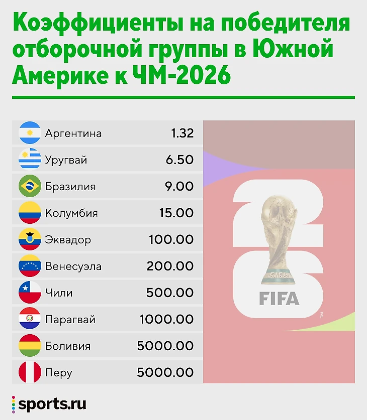 Что еще загадали букмекеры? Например, кто выиграет южноамериканскую отборочную группу, где традиционно участвуют десять сборных. Сейчас после шести туров лидирует Аргентина с 15 очками, у Уругвая – 13, у Колумбии – 12, у Венесуэлы – 9, у Эквадора – 8, у Бразилии – 7. Именно первые шесть команд выходят напрямую.