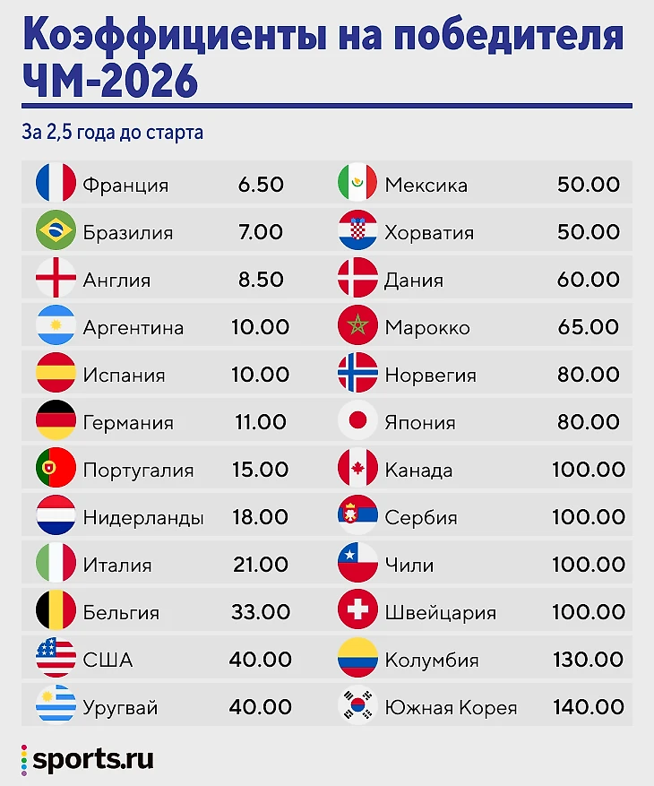 Да, есть коэффициенты на победителя ЧМ-2026 за пару лет до начала. Вот как они распределены: