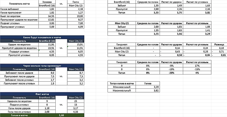 Эта большая картинка, лишь выдержка из модели, которую я строю. Тут пример вчерашнего матча между Брентфордом и Ман Сити. Дальше уже на основе этих данных я строю расчеты и вывожу статистические показатели для прогноза. Самое интересное для меня в этой табличке не то, что считается до матча, а то что считается после матча. Я всегда сравниваю для себя результат ПРЕДСКАЗАЛ/СЛУЧИЛОСЬ. Как удары и угловые влияют на результат. Как видите, на матче Брент - Сити, плюс минус посчиталось +- верно и попали в прогноз. Такие показатели меня очень радуют, ведь я таким образом вижу своими глазами, что если правильно посчитать количество ударов и угловых, можно увеличить шансы на прогноз матча по голам.